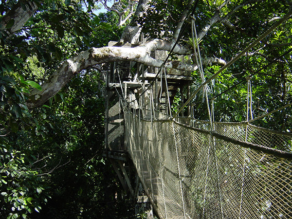 DAY 3: Morning hike to the Canopy Walkway, a suspended bridge spanning 500 meters (one-third of a mile) connected by tree platforms and reaching a height of over 35 meters (115 feet) above the ground. Here you encounter a "bird's eye view" of part of the rainforest rarely seen by man but accessible without any type of climbing skill or equipment. Afternoon boating excursion along one of the many Napo tributaries spotting along the way for birds and sloth. A stop is included for a try at river fishing with cane poles or a chance to swim.