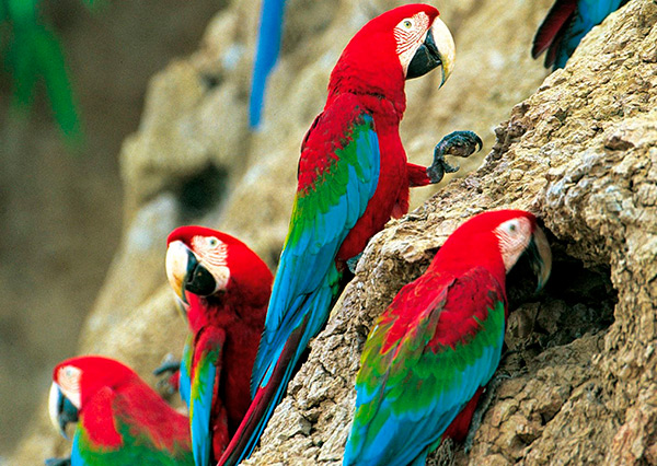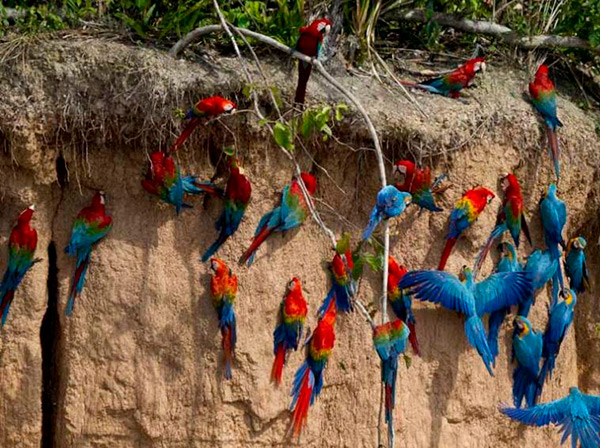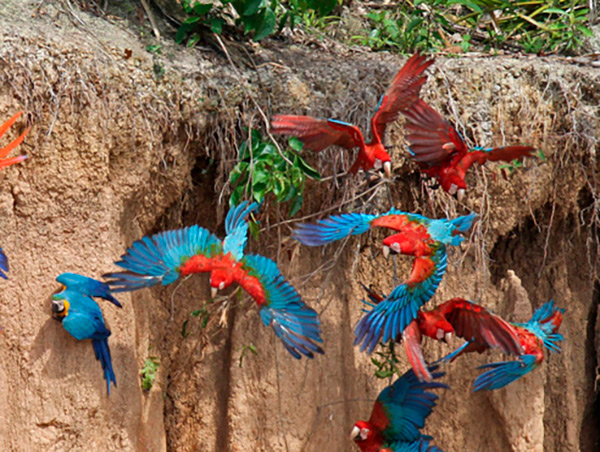 The Tambopata area in southeastern Peru is an amazing place to see macaws and parrots in their natural habitat. Among other places to see them, here are the largest colpas in the Amazon, where hundreds of macaws, amazons and other parrots come to feed each day.